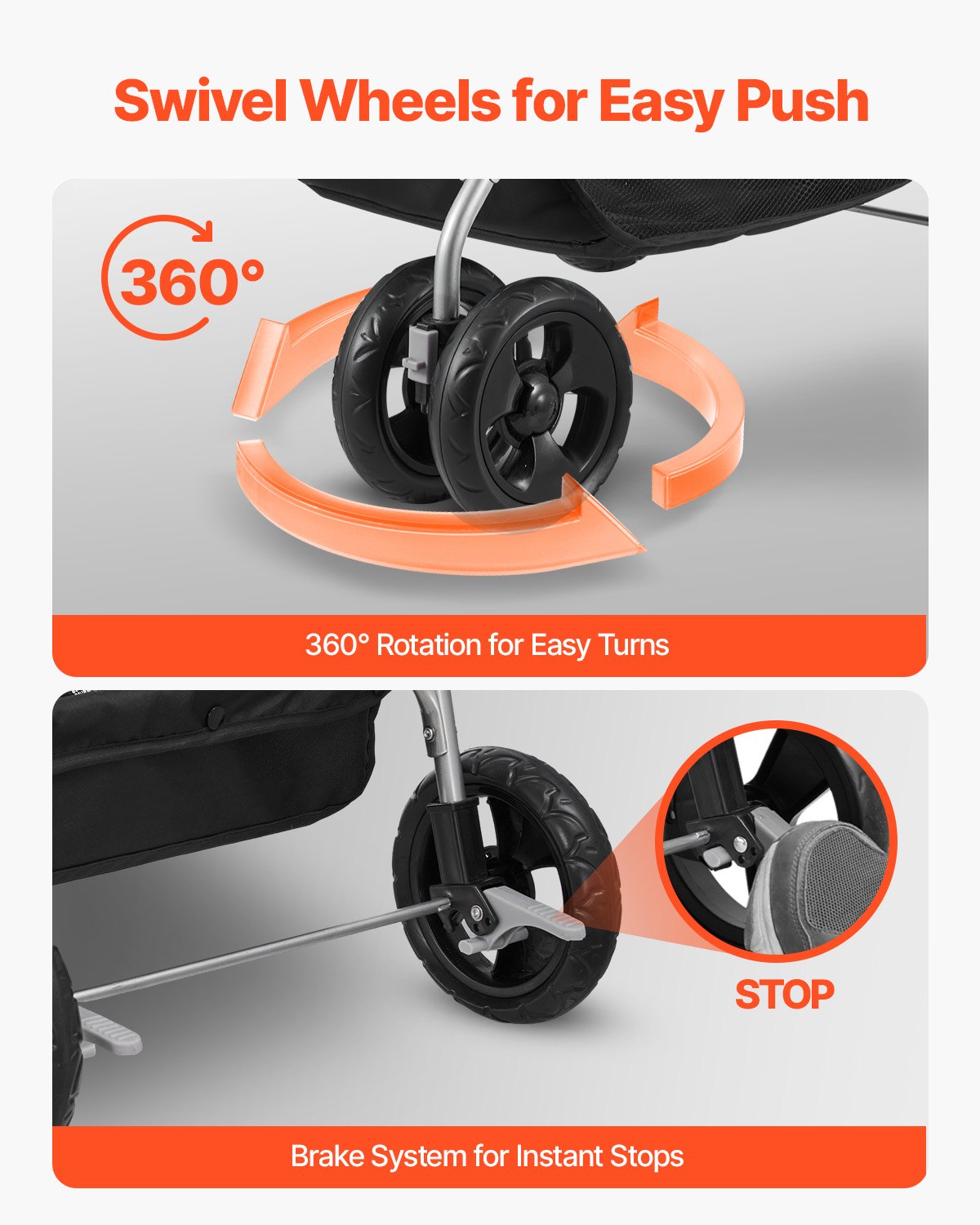 Features & Details Spacious and Comfortable for Pets: Made from 600D Oxford fabric, this pet stroller with breathable mesh windows, provides your pet a spacious and comfortable home. Our doggy stroller ensures your pet feels secure, relaxed, and has a clear view. The enclosed mesh protects pets from external distractions while preventing escapes for maximum security. Sturdy and Durable Design: Built to hold up to 35lbs (16kg), this cat stroller is ideal for small dogs, large cats, or multiple pets. The rust-resistant alloy frame provides lasting stability and reliability, ideal for families with multiple pets or on-the-go adventures. Detachable Carrier for Easy Travel: The dog stroller with detachable basket that easily secures to your car seat, providing a secure and cozy space for your pet during long trips. Keeps pets secure and comfortable on the road. The storage compartment ideal for holding pet snacks and toys. Quick One-Hand Fold: Effortlessly fold the pet stroller for dogs with a single hand for compact storage. It fits easily into your car trunk or small spaces at home, ideal for travel, outings, or daily use. Smooth and Stable Mobility: Featuring 6-inch EVA foam wheels for shock absorption, this foldable pet stroller offers versatility across grass, sidewalks, and sand. A 360° rotating front wheel ensures easy navigation, while rear brakes provide security during stops.